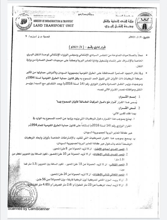 أعلن جهاز تنظيم النقل البرى والداخلى والدولى، عدم السماح بدخول الشاحنات المخالفة الأوزان إلى الأراضى السودانية اعتبارا من غدا الخميس 18 مارس الجارى، تطبيقا لقرار وزارة البنية التحتية والنقل السودانية رقم 9 لسنة 2021.