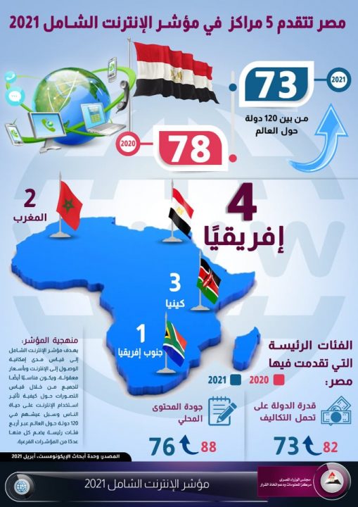 وقال المركز إن مصر ما زالت مستمرة فى طريقها نحو التطور التكنولوجى وتنفيذ خطط التحول الرقمي؛ حيث تقدم ترتيبها فى المؤشر 5 مراكز؛ لتصبح فى المركز الـ73 فى 2021 من بين 120 دولة عالميًّا، مقارنةً بالمركز الـ78 فى 2020، كما احتلت المركز الرابع إفريقيًّا بعد كلٍّ من جنوب إفريقيا والمغرب وكينيا على التوالي، ويرجع الفضل فى ذلك إلى تقدمها الملحوظ فى فئة جودة المحتوى المحلى المناسب لكل أطياف المجتمع، الذى قفزت فيه 12 مركزًا.