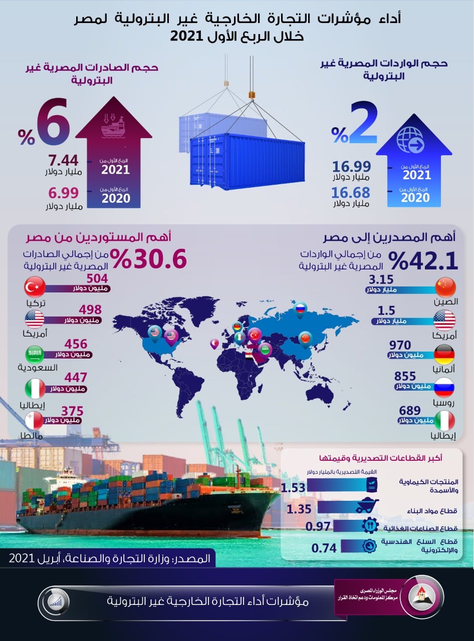 حققت الصادرات المصرية غير البترولية زيادة ملحوظةً خلال الربع الأول من عام 2021 بنسبة 6%؛ حيث أصبحت قيمتها 7.44 مليارات دولار، مقارنة بـنحو 6.99 مليارات دولار خلال الفترة نفسها من عام 2020.
