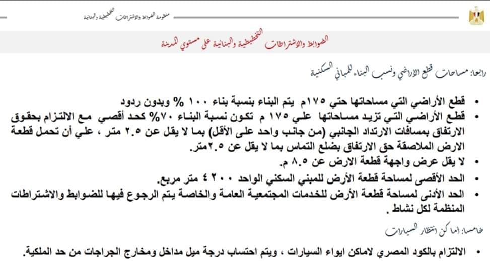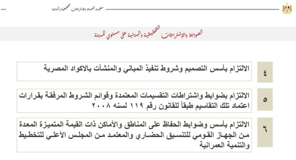 وقال شعراوى إن هذه الاشتراطات الجديدة تم التوافق عليها وجاءت بعد عدة شهور من الدراسة والمراجعة والاجتماعات المتواصلة بين وزارات التنمية المحلية والإسكان والمرافق والمجتمعات العمرانية والتعليم العالى والبحث العلمى والتخطيط والتنمية الاقتصادية والعرض على رئيس مجلس الوزراء ولجنتى الإدارة المحلية والإسكان بمجلس النواب ورؤساء الهيئات البرلمانية للأحزاب فى ندوة الحوار المجتمعى التى نظمتها الأمانة العامة لحزب “مستقبل وطن”.