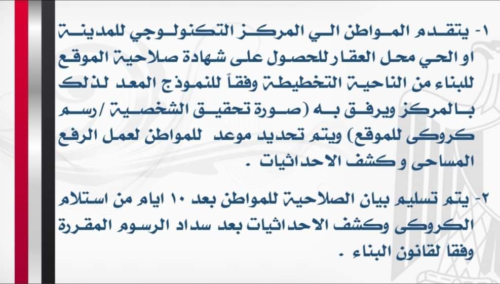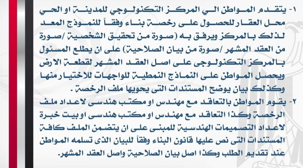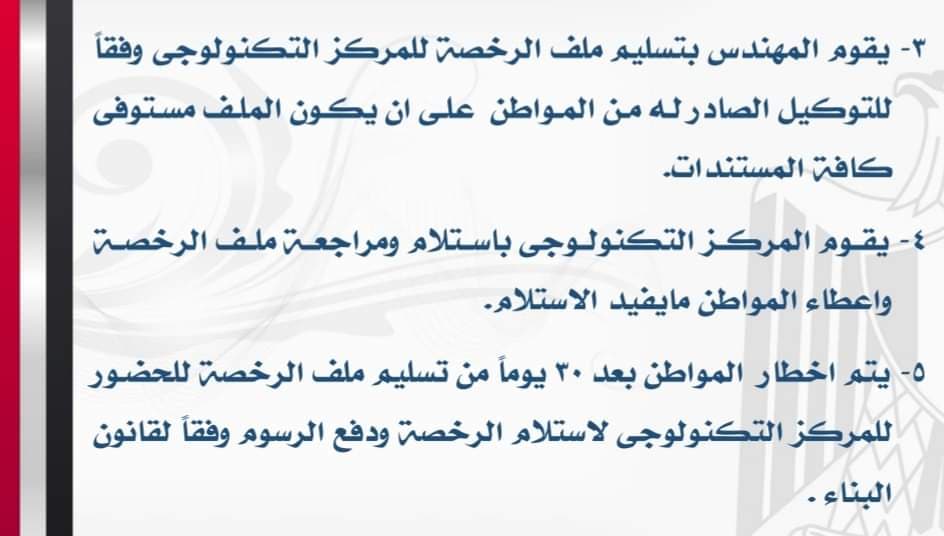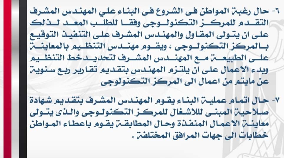 ولفت وزير التنمية المحلية الى أن المراكز التكنولوجية سيكون لها دور مهم جداً فى المنظومة الجديدة بدءاً من استلام الملف بالكامل ثم تحويله الى الجامعة وبعد موافقتها يعود للمركز ويحصل على الموافقة والختم ثم لجنة الفحص وأخيراً الهيئة الهندسية للقوات المسلحة والتى ستصدر رخصة مؤمنة من مركز الوثائق المؤمنة للعقار ويصدر أيضاً خطابات للمرافق بأن العقار جاهز لادخال المرافق به وفقاً لما جاء بالرخصة وبناء عليه يتم استخراج رخصة للمواطن.