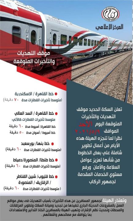 أعلنت هيئة السكة الحديد موقف التهديات والتأخيرات المتوقعة اليوم الأحد 9 – 5 – 2021، نظرا لما تنفذه الهيئة هذه الأيام من أعمال تطوير شاملة على بعض الخطوط من شأنها تعزيز عوامل السلامة والأمان ورفع مستوى الخدمات المقدمة لجمهور الركاب.