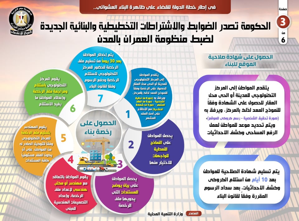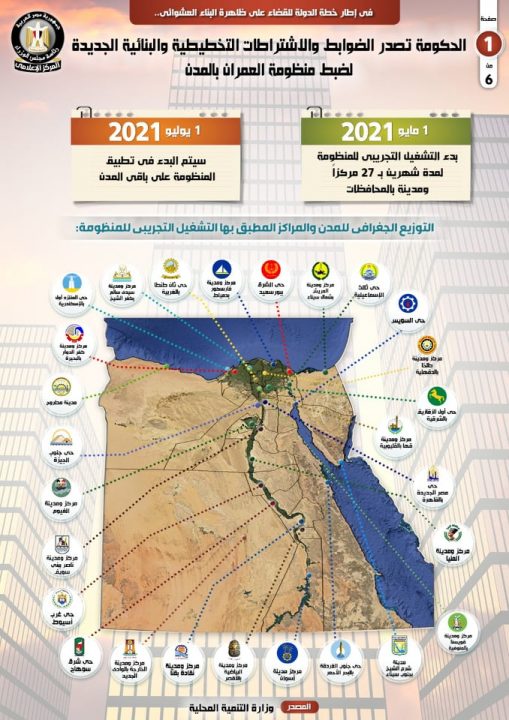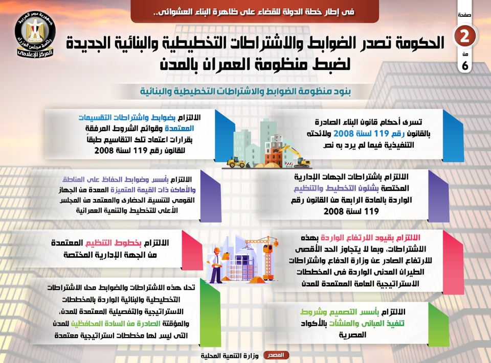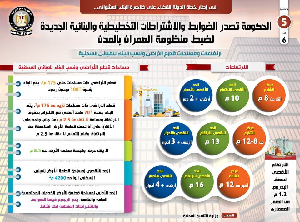أصدر المركز الإعلامى لمجلس الوزراء، تقريراً تضمن إنفوجرافات سلطت الضوء على الضوابط والاشتراطات التخطيطية والبنائية الجديدة التى أصدرتها الحكومة لضبط منظومة العمران بالمدن، وذلك فى إطار خطة الدولة للقضاء على ظاهرة البناء العشوائي.