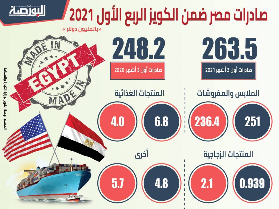 ارتفعت الصادرات المصرية ضمن اتفاقية المناطق الصناعية المؤهلة “الكويز” بنسبة 6% خلال الربع الأول من العام الحالي، لتصل إلى 263.5 مليون دولار مقابل 248.2 مليون دولار خلال الفترة نفسها من العام الماضي.