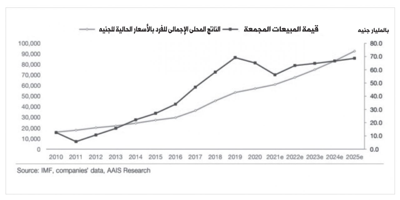 ورجح أن تحقق الشركات نموًا فى المبيعات بواقع %5.2 سنويا، خلال الفترة من 2022 إلى 2025 لتصل إلى مبيعات بقيمة 68.7 مليار جنيه بنهاية 2025.