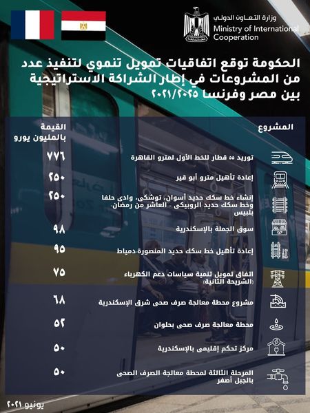 ووقعت الحكومة مشروع توريد عدد 55 قطار للخط الأول لمترو القاهرة بتمويل تنموي قدره 776 مليون يورو مقدم من الخزانة الفرنسية، تستفيد منه الهيئة القومية للأنفاق، وذلك دعمًا للخطط الحكومية الهادفة لتطوير وسائل النقل وتعزيز البنية التحتية المستدامة للقطاع وتحسين الخدمات المقدمة للمواطنين.