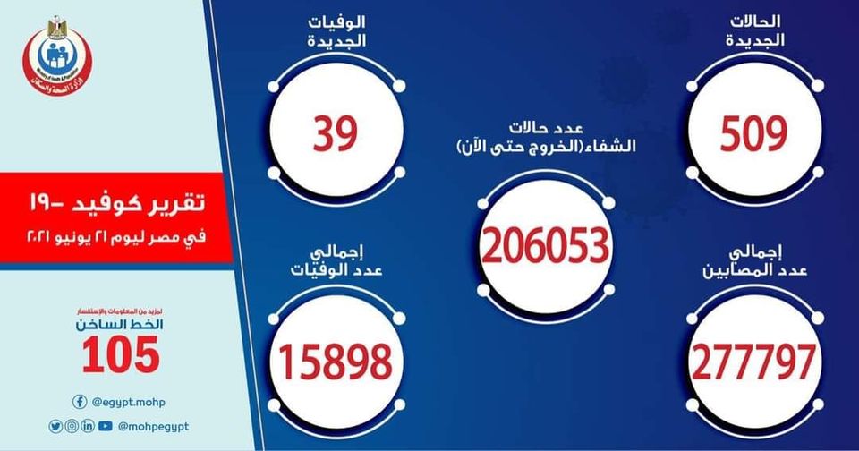 الصحة: تسجيل 509 حالات إيجابية جديدة بفيروس كورونا .. و 39 حالة وفاة