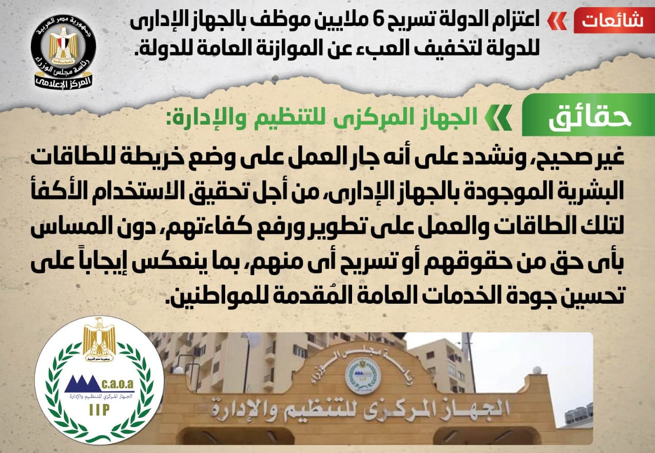 نفي المركز الإعلامي لمجلس الوزراء ما تردد من أنباء بشأن اعتزام الدولة تسريح 6 ملايين موظف بالجهاز الإداري للدولة لتخفيف العبء عن الموازنة العامة للدولة.