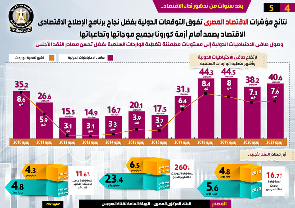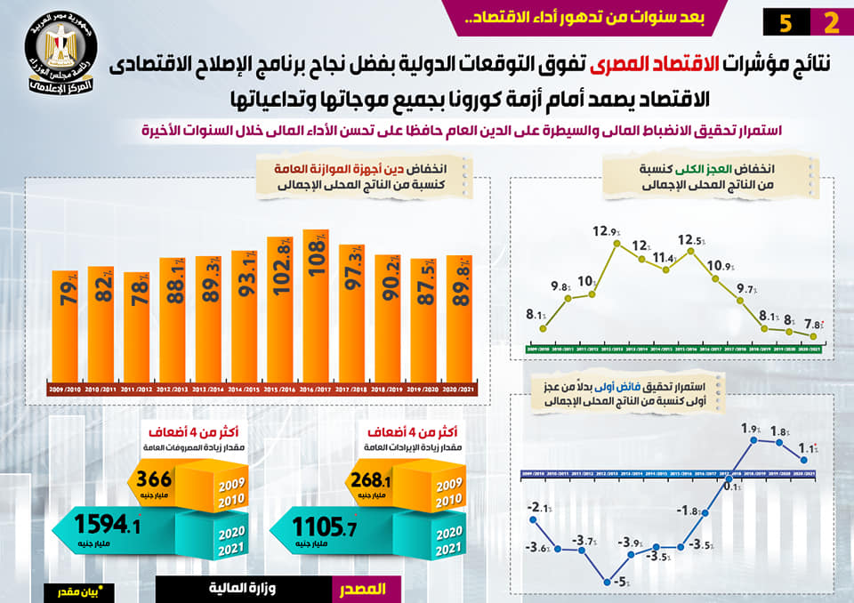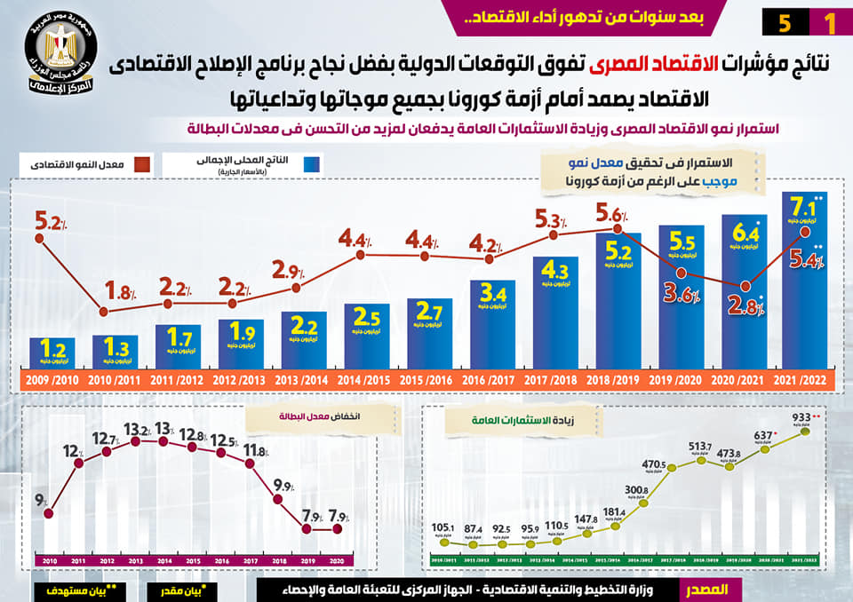 وفي هذا الصدد، نشر المركز الإعلامي لمجلس الوزراء، تقريراً تضمن إنفوجرافات تسلط الضوء على تفوق نتائج مؤشرات الاقتصاد المصري على التوقعات الدولية بفضل نجاح برنامج الإصلاح الاقتصادي، وصمود الاقتصاد أمام أزمة كورونا بجميع موجاتها وتداعياتها، وذلك بعد سنوات من تدهور أداء الاقتصاد.