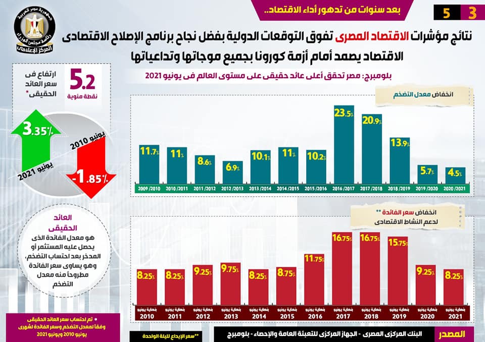 وكشف التقرير عن تحقيق مصر أعلى عائد حقيقي على مستوى العالم في يونيو 2021 وفقاً لوكالة بلومبرج، مشيراً في الوقت نفسه إلى انخفاض معدل التضخم، حيث سجل 4.5% عام 2020-2021 مقارنة بـ 5.7% عام 2019-2020، و13.9% عام 2018-2019، و20.9% عام 2017-2018، و23.5% عام 2016-2017، و10.2% عام 2015-2016، و11% عام 2014-2015، و10.1% عام 2013-2014، و6.9% عام 2012-2013، و8.6% عام 2011-2012، و11% عام 2010-2011، و11.7% عام 2009-2010.
