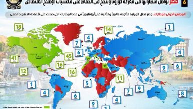واحتلت مصر وفقاً للمجلس الدولى للمطارات المرتبة الثامنة عالمياً والثانية قارياً وإقليمياً فى عدد المطارات التى حصلت على شهادة الاعتماد الصحى، وذلك بـ11 مطار، فيما بلغ عدد المطارات التى حصلت على شهادة الاعتماد الصحى فى إسبانيا 45 مطاراً، والولايات المتحدة الأمريكية 41 مطاراً، وكندا 18 مطاراً، وكل من المغرب وإيطاليا 16 مطاراً، واليونان 14 مطاراً، والمكسيك 12 مطاراً.