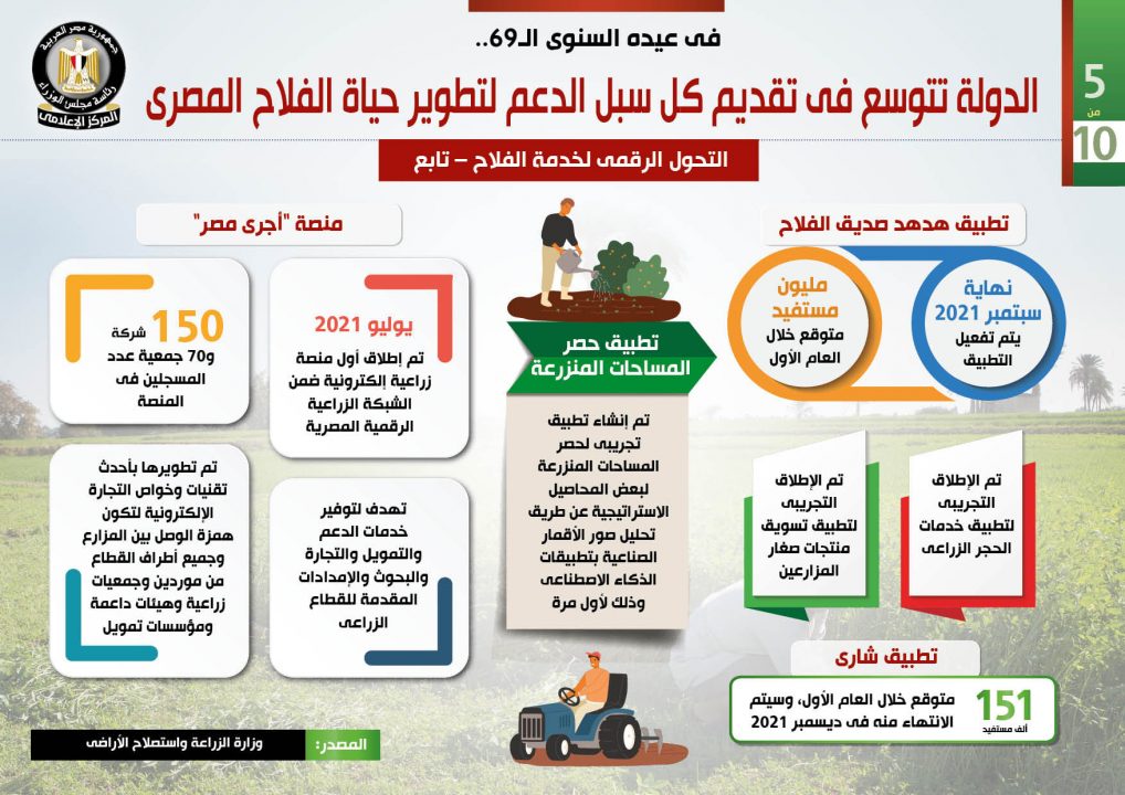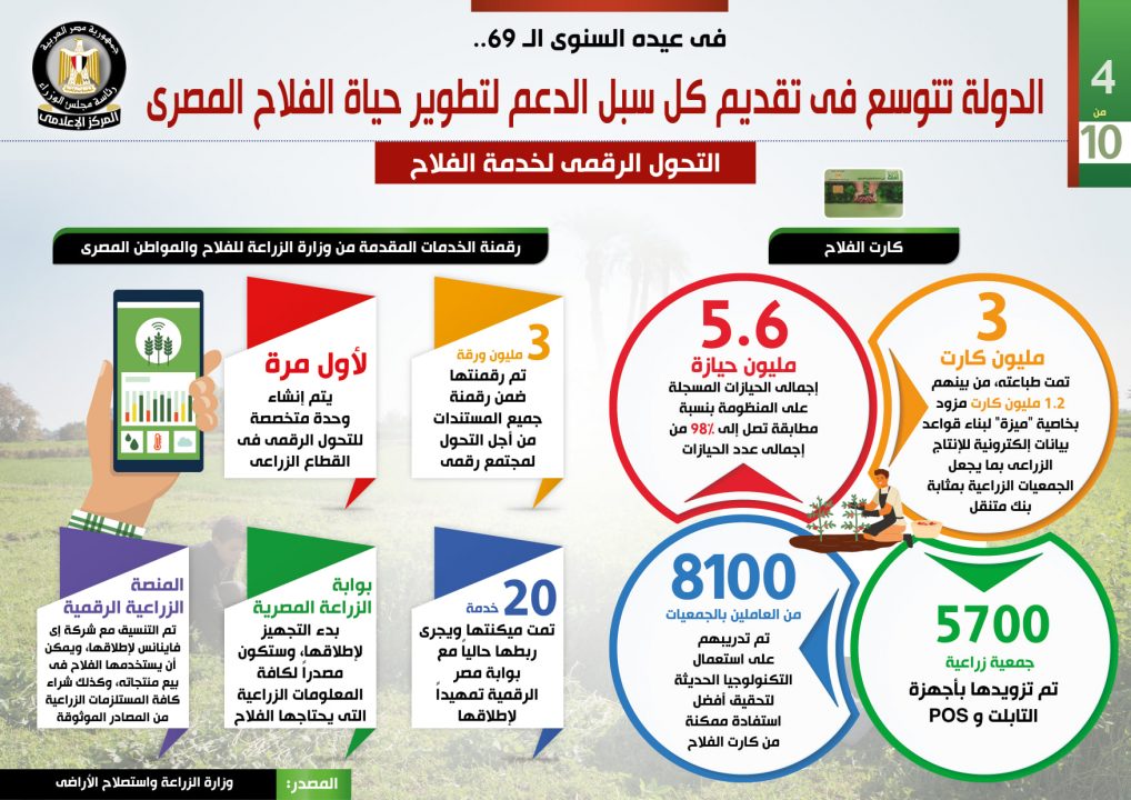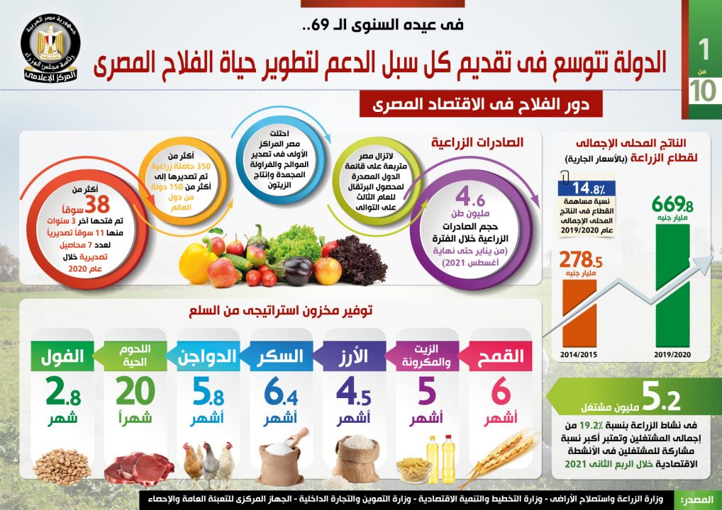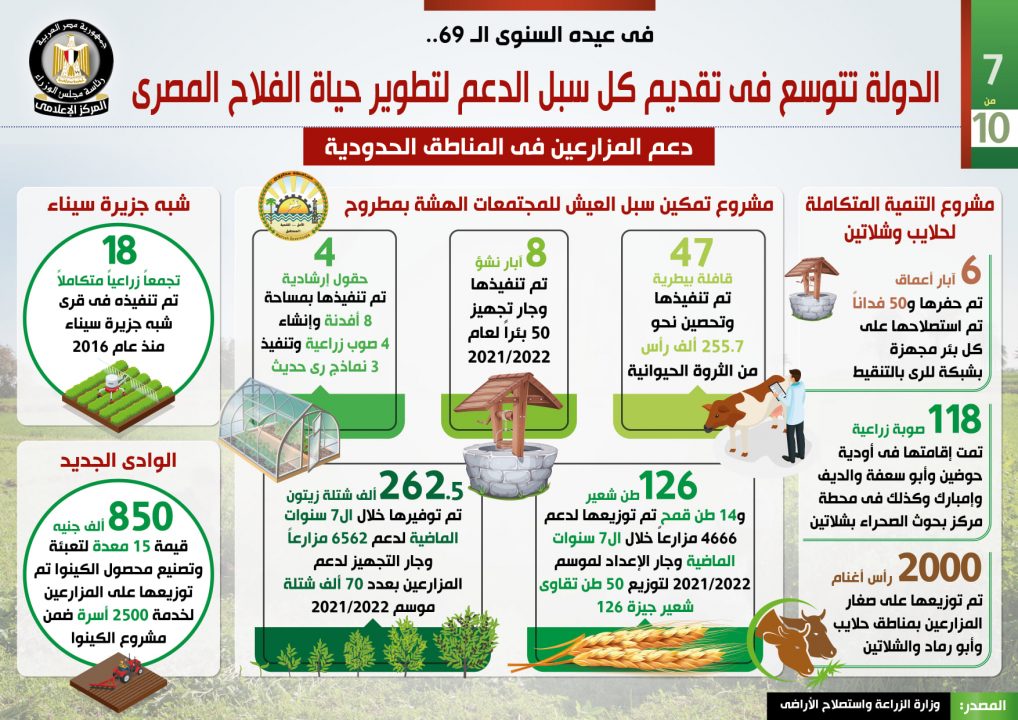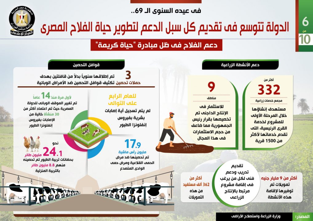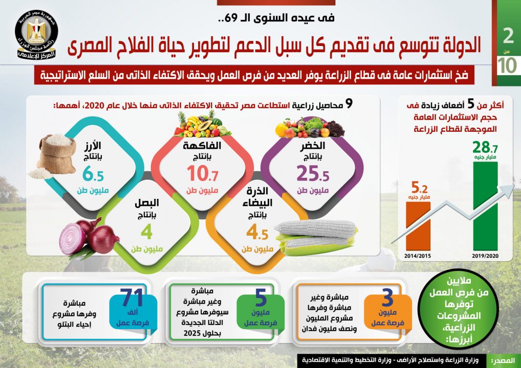 وفي هذا الصدد نشر المركز الإعلامي لمجلس الوزراء تقريراً تضمن إنفوجرافات تسلط الضوء على جهود الدولة في تقديم كل سبل الدعم لتطوير حياة الفلاح المصري.