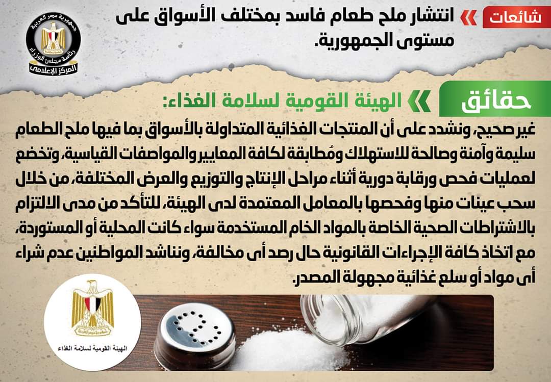 نفى المركز الإعلامي لمجلس الوزراء ما انتشر من أنباء بشأن انتشار ملح طعام فاسد بمختلف الأسواق على مستوى الجمهورية.