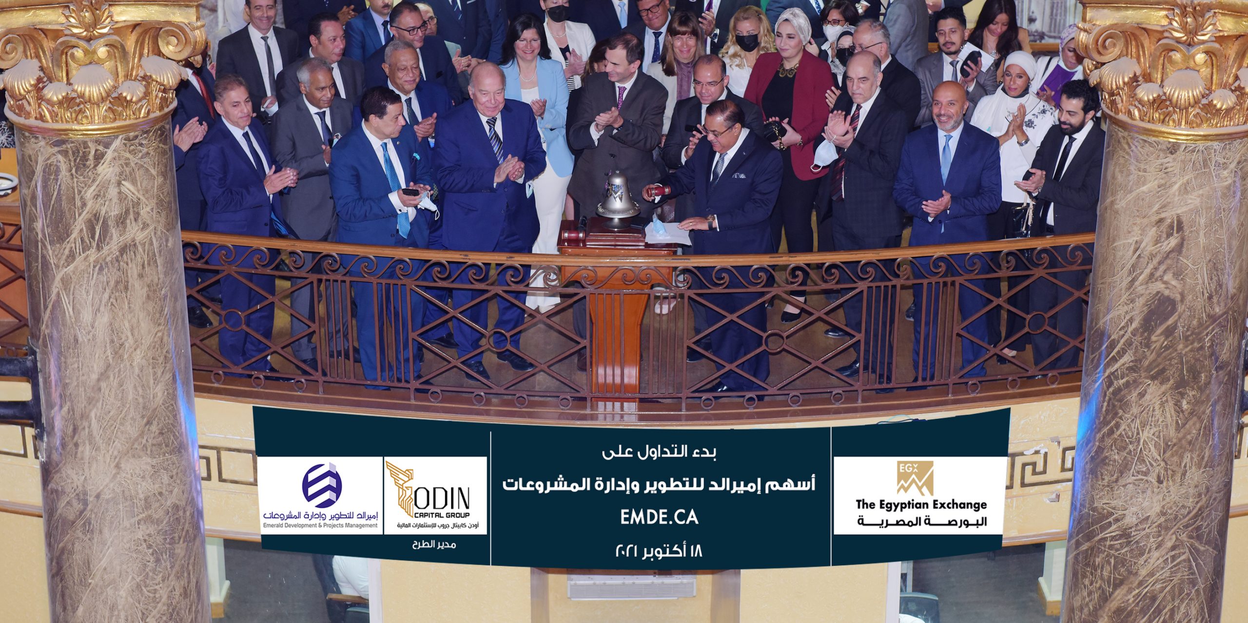 وسيتم تداولها تحت رمز ” EMDE.CA ” وذلك بحضور الدكتور محمد فريد صالح رئيس البورصة المصرية، وعدد من قيادات شركة اميرالد للتطوير وفرق العمل المسئولة عن الترويج والطرح، وكذلك قيادات البنك الأوروبي لإعادة الإعمار والتنمية وكافة الأطراف ذات الصلة بسوق الشركات الصغيرة والمتوسطة.