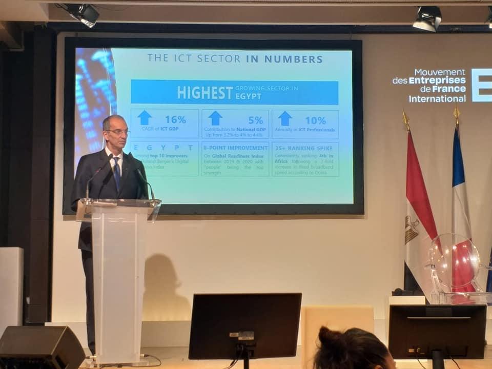 فى إطار زيارة الدكتور مصطفى مدبولى رئيس مجلس الوزراء والوفد المرافق له للعاصمة الفرنسية باريس؛ ألقى الدكتور عمرو طلعت وزير الاتصالات وتكنولوجيا المعلومات كلمة أمام رؤساء وممثلى مجموعة من كبرى الشركات الفرنسية بمقر مجلس أرباب الأعمال الفرنسي “MEDEF” ، استعرض خلالها الفرص الاستثمارية المتاحة بقطاع الاتصالات وتكنولوجيا المعلومات فى ضوء تنفيذ استراتيجية مصر الرقمية، وكذلك مشروعات التعاون الحالية والمستقبلية بين مصر وفرنسا فى مجال الاتصالات وتكنولوجيا المعلومات.