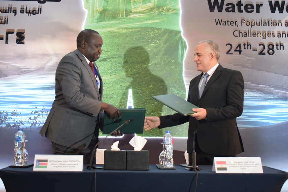 وقع الدكتور محمد عبد العاطى، وزير الموارد المائية والرى، وماناوا بيتر، وزير الموارد المائية والرى بدولة جنوب السودان، مذكرة تفاهم بين البلدين فى مجال الموارد المائية والرى، خلال حفل ختام أسبوع القاهرة الرابع للمياه.