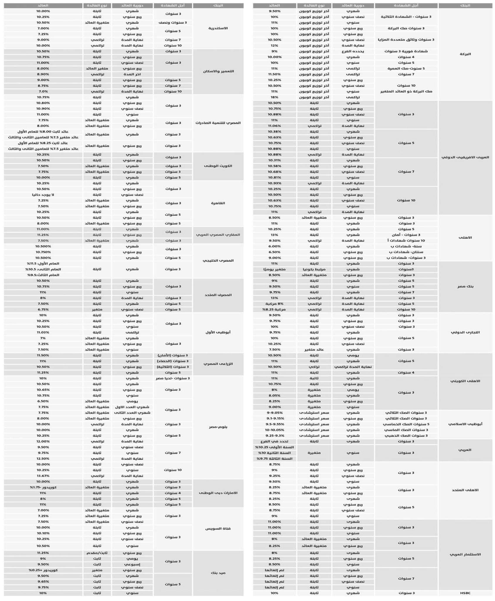 ويقدم «ميد بنك» أعلى عائد ربع سنوى بواقع %11.25، فيما يقدم عدد من البنوك بينها الأهلى ومصر والزراعى المصرى والأهلى الكويتى والاستثمار العربى أعلى عائد ذو دورية صرف شهرية بمعدل %11.