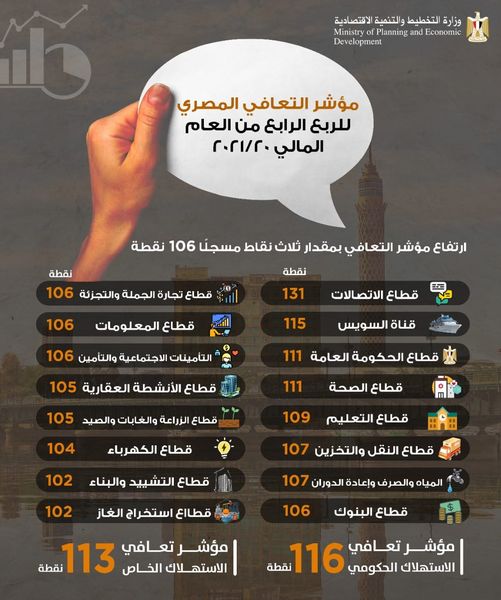 تلقت الدكتورة هالة السعيد، وزيرة التخطيط والتنمية الاقتصادية تقريرًا من وحدة الاقتصاد الكلي بالوزارة حول مؤشر التعافي المصري للربع الرابع من العام المالي 2020-2021، حيث أشار التقرير إلى ارتفاع المؤشر بمقدار ثلاث نقاط مسجلًا 106 نقطة مرتفعًا من 103 نقطة في الربع السابق في ذات العام، وهو ما يشير إلى استمرار تعافي الاقتصاد المصري.