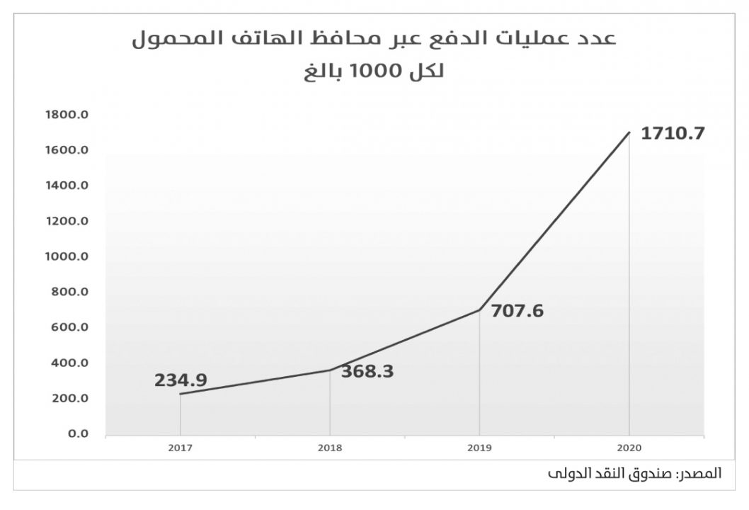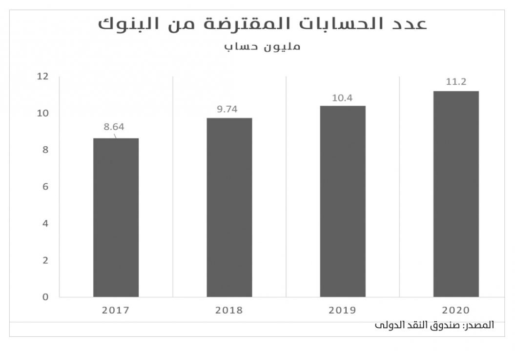 وبحسب بيانات صندوق النقد الدولي، فإن عدد مستخدمى محافظ المحمول النشطين تضاعف إلى 2.36 مليون حساب فى 2020 مقابل 1.148 مليون حساب ، وذلك تزامنا مع ارتفاع عدد الحسابات المسجلة إلى 19.8 مليون حساب مقابل 14.9 مليون فى 2019.