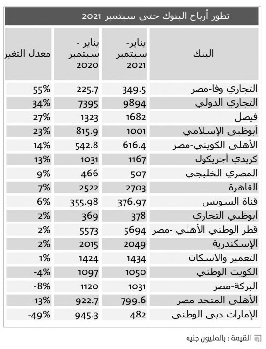 جاء بنك التجارى وفا-مصر، فى مقدمة البنوك التى نمت بأرباحها بمعدل %55، إذ وصلت 349.5 مليون جنيه مقابل 225.7 مليون جنيه، وذلك بدعم من نمو صافى الدخل من العائد %9 ليصل إلى 1.44 مليار جنيه، ونمو صافى الدخل من الأتعاب والعمولات %20 لتصل إلى 245.7 مليون جنيه، وتراجع المصروفات الإدارية إلى 801.6 مليون جنيه مقابل 831 مليونًا، ومصروفات التشغيل الأخرى إلى 138.5 مليون جنيه مقابل 190.4 مليون.