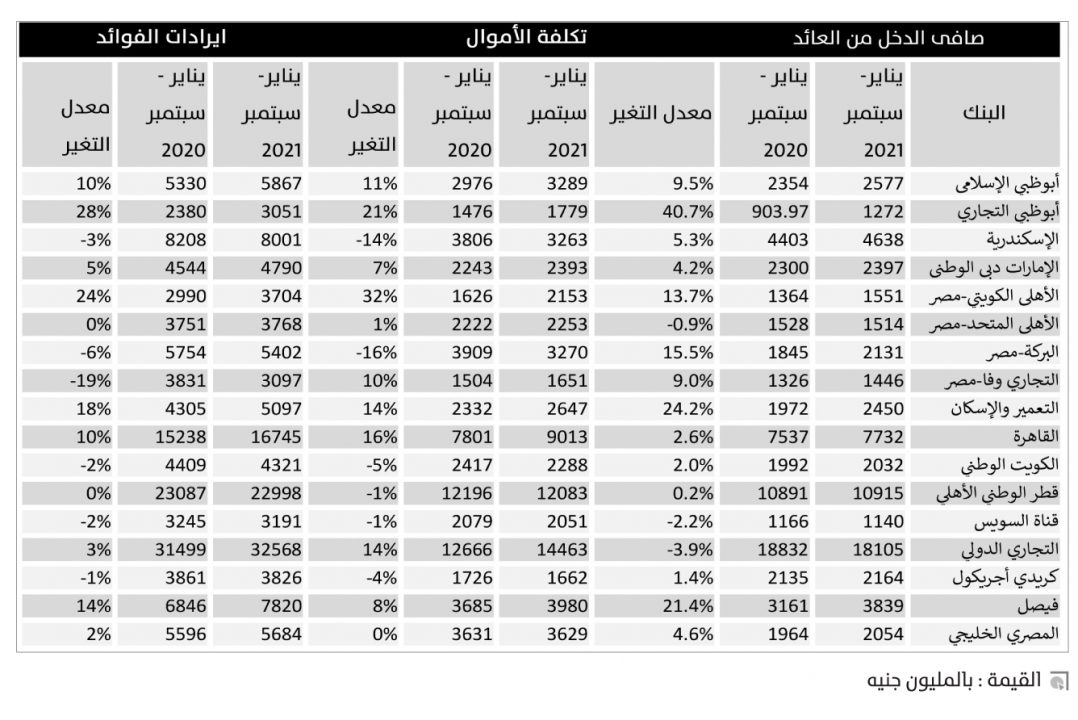 وخلال الشهور التسعة الأولى من 2021، ارتفعت تكلفة الأموال لدى 8 بنوك بوتيرة أسرع من نمو إيرادات الفوائد لديها، وبصفة عامة بين الـ17 بنكا التى رصد المسح نتائج أعمالها تراجعت تكلفة الأموال لدى 6 بنوك فيما انخفضت إيرادات الفوائد لدى 5 بنوك.
