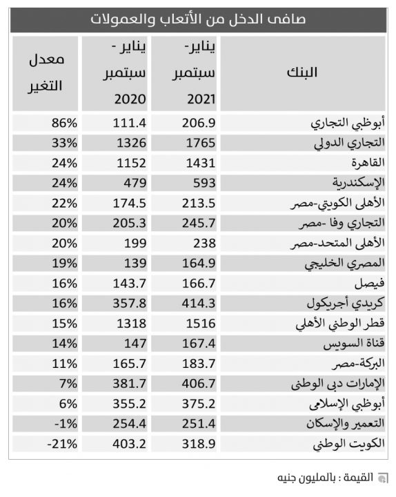 فى الوقت نفسه، كان النمو فى صافى الدخل من الأتعاب والعمولات ملحوظًا لدى معظم البنوك، إذ ارتفع لدى 15 بنكًا، وبلغ معدل نموه %86 لدى «أبوظبى التجاري» وتراوح بين %15 و%33 لدى 10 بنوك، ونما بين %7 و%14 لدى 4 بنوك، فيما انخفض فقط لدى بنك التعمير والإسكان بنحو %1 وبنك الكويت الوطنى – مصر بنحو %21.