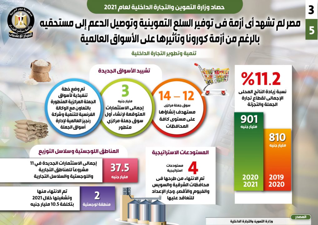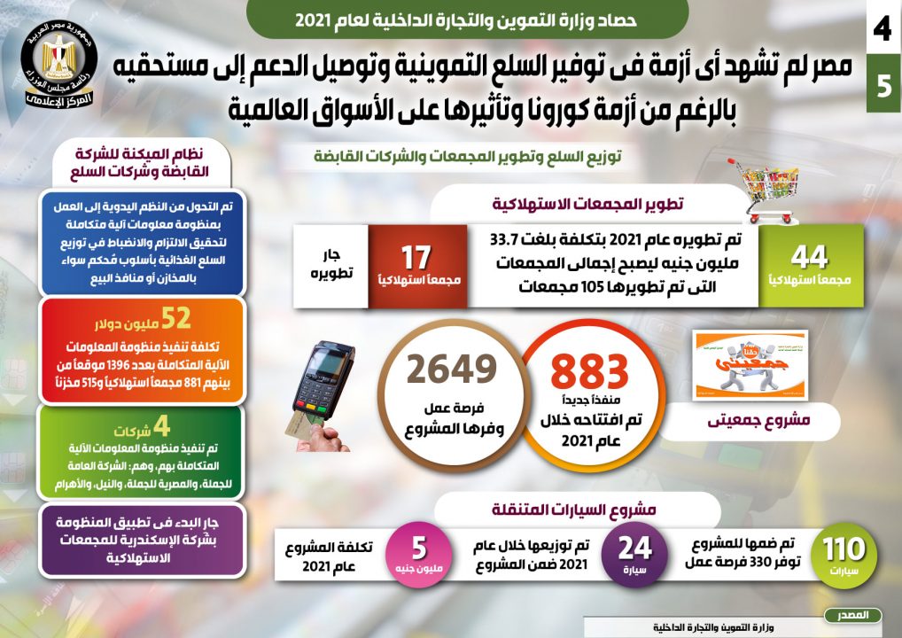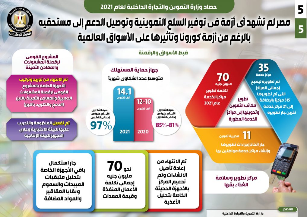 نشر المركز الإعلامي لمجلس الوزراء تقريراً تضمن إنفوجرافات تسلط الضوء على حصاد وزارة التموين والتجارة الداخلية، في إطار سلسلة متتابعة من التقارير بشأن حصاد قطاعات الدولة في عام 2021.