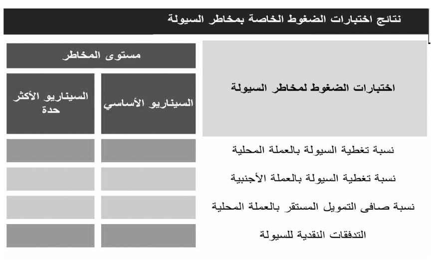 وجاءت نتائج الاختبار عبارة عن ضغوط خفيفة فى نسبتى تغطية السيولة بالعملة المحلية والتدفقات النقدية بالسيولة، فيما كانت الضغوط متوسطة فى نسبتى تغطية السيولة بالعملة الأجنبية وصافى التمويل المستقر بالعملة المحلية.