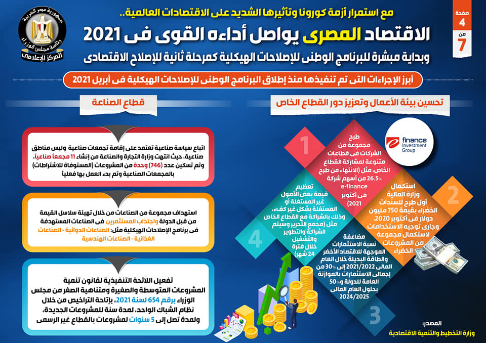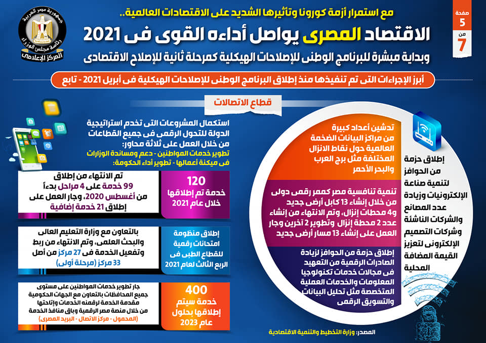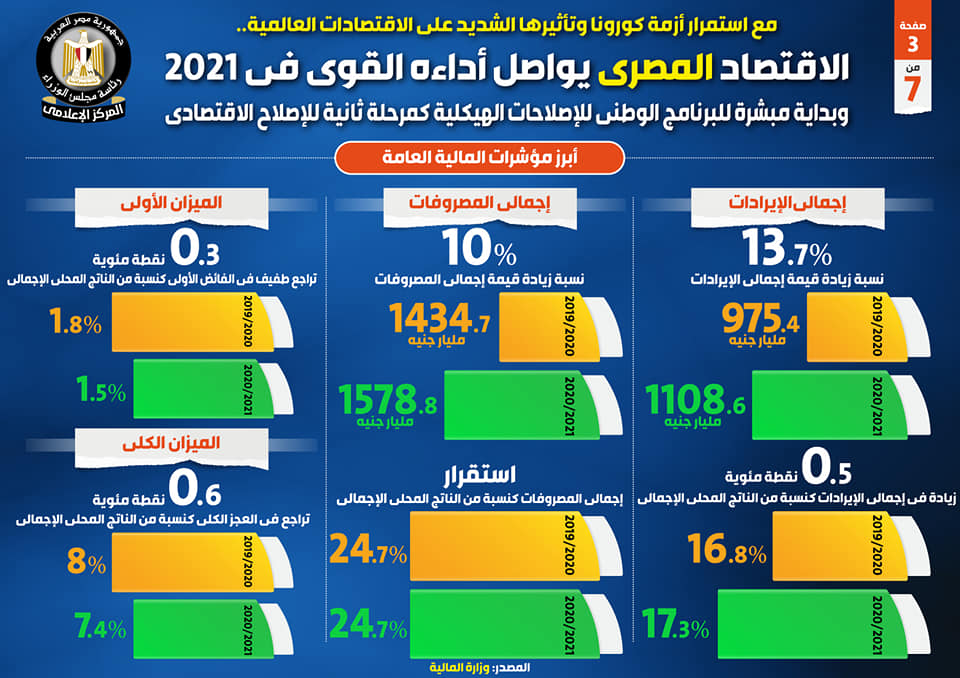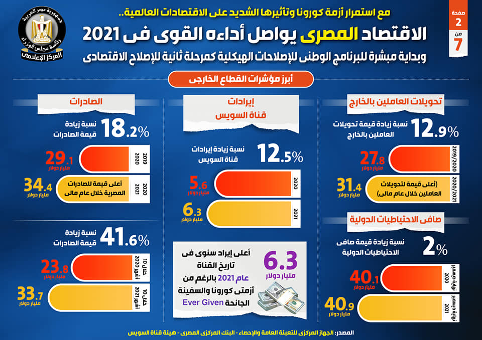 نشر المركز الإعلامي لمجلس الوزراء، تقريراً تضمن إنفوجرافات تسلط الضوء على مواصلة الاقتصاد المصرى أداءه القوي في 2021 والبداية المبشرة للإصلاحات الهيكلية كمرحلة ثانية للإصلاح الاقتصادي.