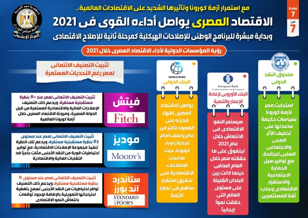 هذا وقد رصد التقرير رؤية المؤسسات الدولية لأداء الاقتصاد المصرى خلال عام 2021، لافتاً إلى إشادة صندوق النقد الدولي بالسياسات الحكيمة التي اتخذتها مصر استجابة لأزمة كورونا، والتي ساعدتها على تخفيف الأثر الصحي والاجتماعي السلبي للجائحة، مع توفير سبل الحماية الاجتماعية والاستقرار الاقتصادي وجذب ثقة المستثمرين.