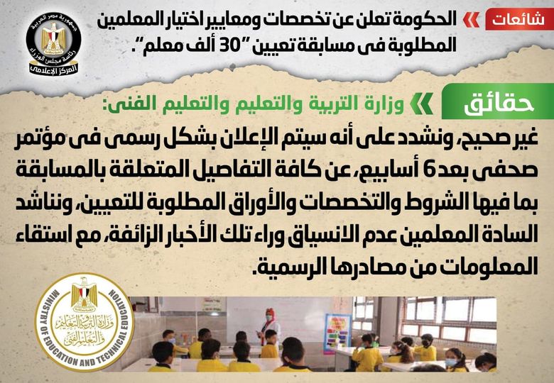 نفي المركز الإعلامي لمجلس الوزراء ما انتشر من أنباء بشأن إعلان الحكومة عن تخصصات ومعايير اختيار المعلمين المطلوبة في مسابقة تعيين “30 ألف معلم ” .