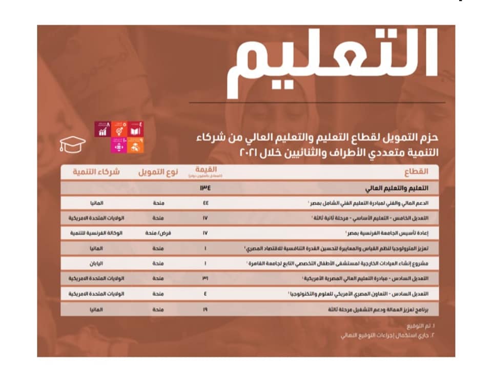 أعلنت وزارة التعاون الدولي، عن تفاصيل التمويلات التنموية التي تم الاتفاق عليها خلال عام 2021، في قطاعات التعليم والتعليم العالي والتعليم الفني، والمشروعات الصغيرة والمتوسطة وتمكين المرأة، والتي تأتي في إطار تعزيز العلاقات الاقتصادية والفنية مع شركاء التنمية متعددي الأطراف والثنائيين بهدف دعم رؤية الدولة 2030 التي تتسق مع الأهداف الأممية للتنمية المستدامة.