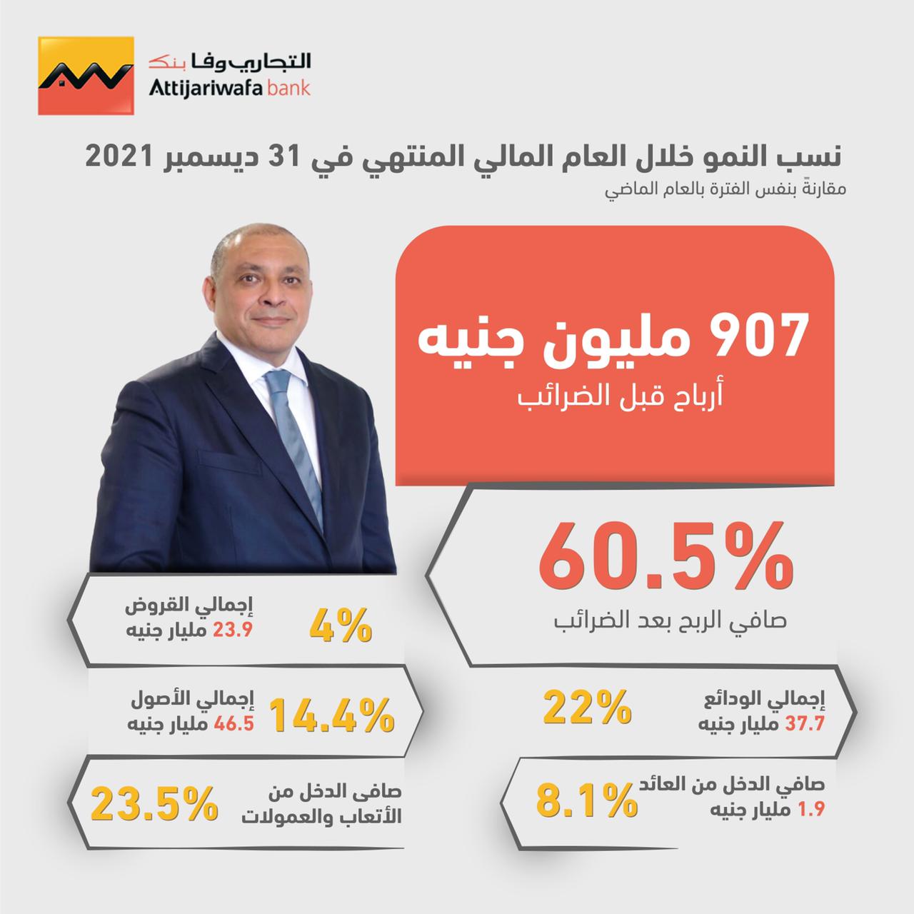 حقق التجاري وفا بنك ايجيبت صافي ربح بعد الضرائب 544 مليون جنيه مصري خلال السنة المالية المنتهية في 31 ديسمبر 2021 مقابل 339 مليون جنيه مصري خلال عام 2020 بنسبة نمو قدرها 60.5% حيث بلغ صافي الدخل من العائد 1.9 مليار جنيه مصري في ديسمبر 2021 مقارنة بـ 1.8 مليار جنيه مصري في العام السابق وذلك بنسبة زيادة قدرها 8.1%، وبلغ صافى الدخل من الأتعاب والعمولات 350 مليون جنيه مصري في ديسمبر 2021 مقابل 283 مليون جنيه مصري خلال العام المنصرم بنسبة زيادة 23.5 %، سجل عبء الاضمحلال مبلغ وقدره 270 مليون جنيه مصري مقابل 232 في عام 2020 بنسبة زيادة 16.4%.