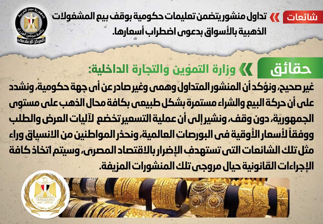 تداولت بعض المواقع الإلكترونية وصفحات التواصل الاجتماعي منشوراً يتضمن تعليمات حكومية بوقف بيع المشغولات الذهبية بالأسواق بدعوى اضطراب أسعارها، وقد قام المركز الإعلامي لمجلس الوزراء بالتواصل مع وزارة التموين والتجارة الداخلية، والتي نفت تلك الأنباء، مؤكدةً أنه لا صحة لوقف بيع المشغولات الذهبية بالأسواق بدعوى اضطراب أسعارها، وأن المنشور المتداول وهمي وغير صادر عن أي جهة حكومية، مُشددةً على أن حركة البيع والشراء مستمرة بشكل طبيعي بكافة محال الذهب على مستوى الجمهورية، دون وقف، مُشيرةً إلى أن عملية التسعير تخضع لآليات العرض والطلب ووفقاً لأسعار الأوقية في البورصات العالمية، مُحذرةً المواطنين من الانسياق وراء مثل تلك الشائعات التي تستهدف الإضرار بالاقتصاد المصري، وسيتم اتخاذ كافة الإجراءات القانونية حيال مروجي تلك المنشورات المزيفة.