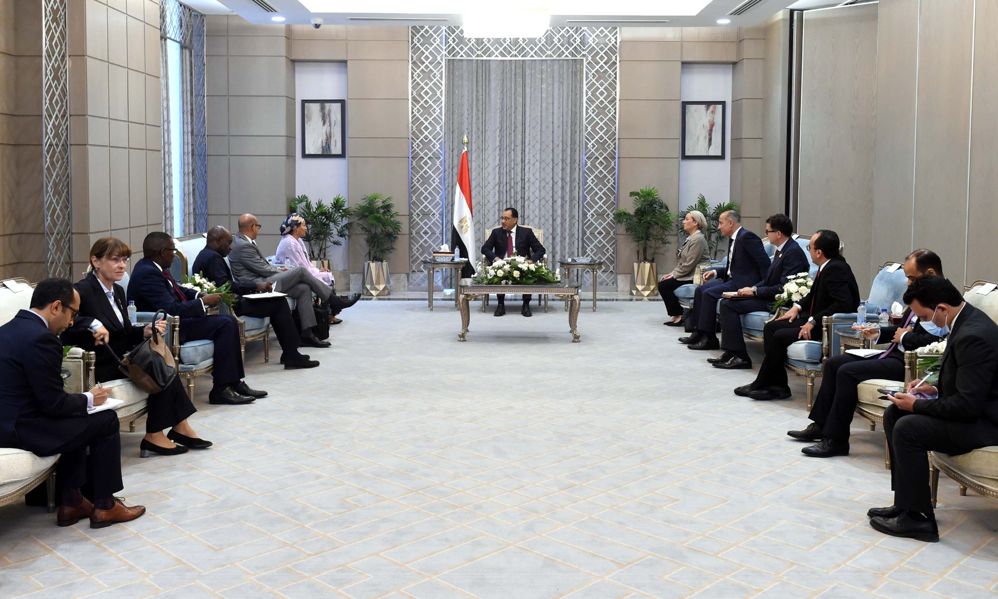 جاء ذلك خلال لقاء الدكتور مصطفى مدبولي، اليوم الأربعاء، أمينة محمد، نائبة الأمين العام للأمم المتحدة، ورئيسة مجموعة الأمم المتحدة للتنمية المستدامة، والوفد المرافق لها، بحضور الدكتورة ياسمين فؤاد، وزيرة البيئة، والسفير وائل أبو المجد، الممثل الخاص لرئيس مؤتمر المناخ، والسفير محمد نصر، مدير إدارة البيئة والتنمية المستدامة بوزارة الخارجية.