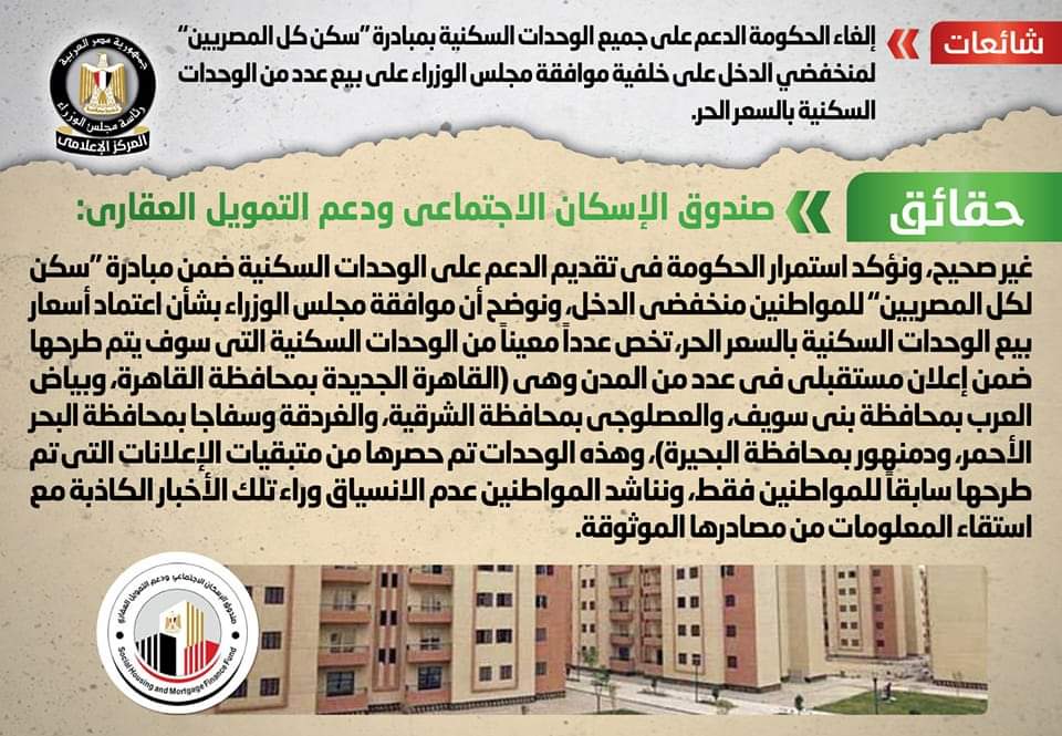 وأكد استمرار الحكومة في تقديم الدعم على الوحدات السكنية ضمن مبادرة “سكن لكل المصريين” للمواطنين منخفضي الدخل، مُوضحًا أن موافقة مجلس الوزراء بشأن اعتماد أسعار بيع الوحدات السكنية بالسعر الحر، تخص عددًا معينًا من الوحدات السكنية التي سيتم طرحها ضمن إعلان مستقبلي في عدد من المدن وهي (القاهرة الجديدة بمحافظة القاهرة، وبياض العرب بمحافظة بنى سويف، والعصلوجي بمحافظة الشرقية، والغردقة وسفاجا بمحافظة البحر الأحمر، ودمنهور بمحافظة البحيرة)، وهذه الوحدات تم حصرها من متبقيات الإعلانات التي تم طرحها سابقاً للمواطنين فقط، مُناشدًا المواطنين عدم الانسياق وراء تلك الأخبار الكاذبة مع استقاء المعلومات من مصادرها الموثوقة.