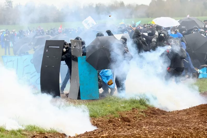 وأطلقت الشرطة الغاز المسيل للدموع لصد بعض المحتجين الذين أطلقوا الألعاب النارية ومقذوفات أخرى في أثناء اجتيازهم لحقول للاقتراب من منطقة بناء الخزان في منطقة سانت سولين الريفية بغرب فرنسا. وأظهرت لقطات تلفزيونية اشتعال النيران في ثلاث مركبات للشرطة على الأقل.