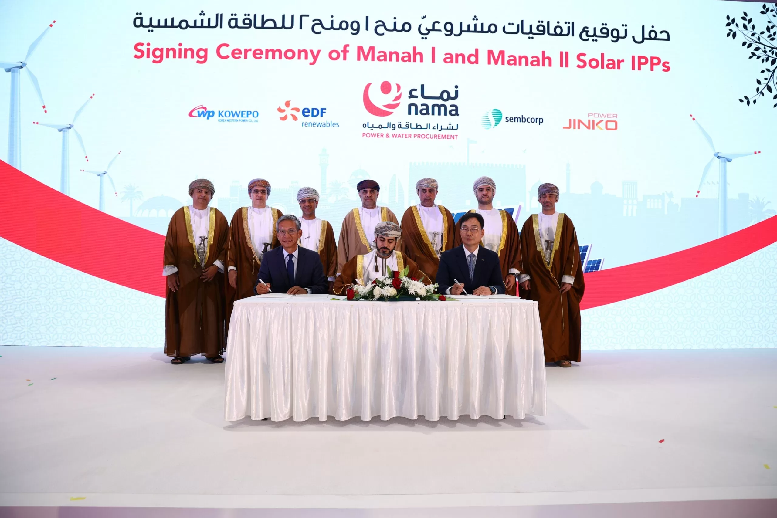 قالت وكالة الأنباء العمانية يوم الخميس إن شركة نماء لشراء الطاقة والمياه وقعت على مشروعين لإنتاج الطاقة الكهربائية باستخدام الطاقة المتجددة بتكلفة 800 مليون دولار وطاقة إنتاجية تبلغ 1000 ميجاوات.