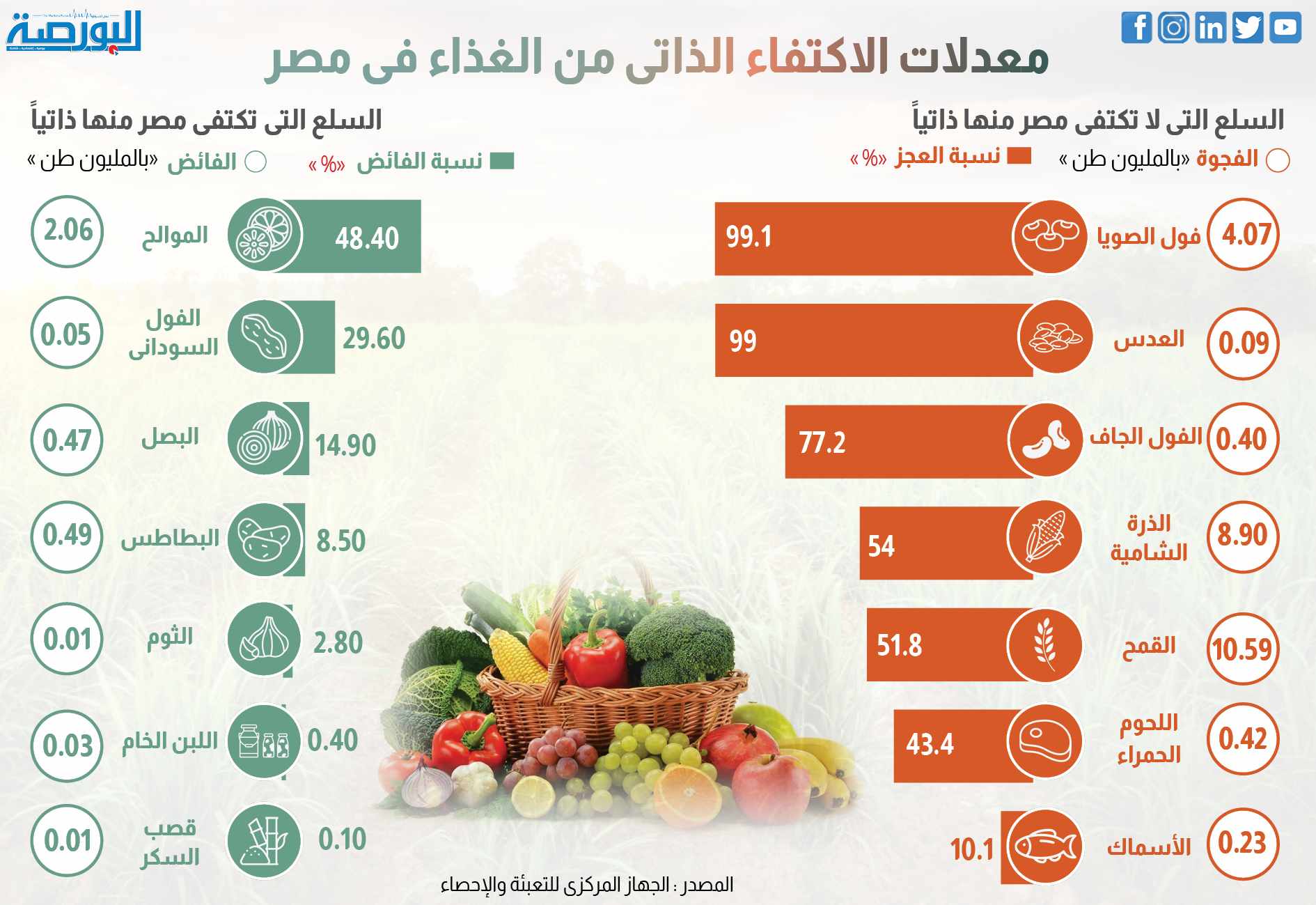 <!-- wp:heading {"textAlign":"center","level":4} --> <h4 class="wp-block-heading has-text-align-center"><strong>أظهرت بيانات الجهاز المركزى للتعبئة العامة والإحصاء معدلات الاكتفاء الذاتى من الغذاء فى مصر.</strong></h4> <!-- /wp:heading -->