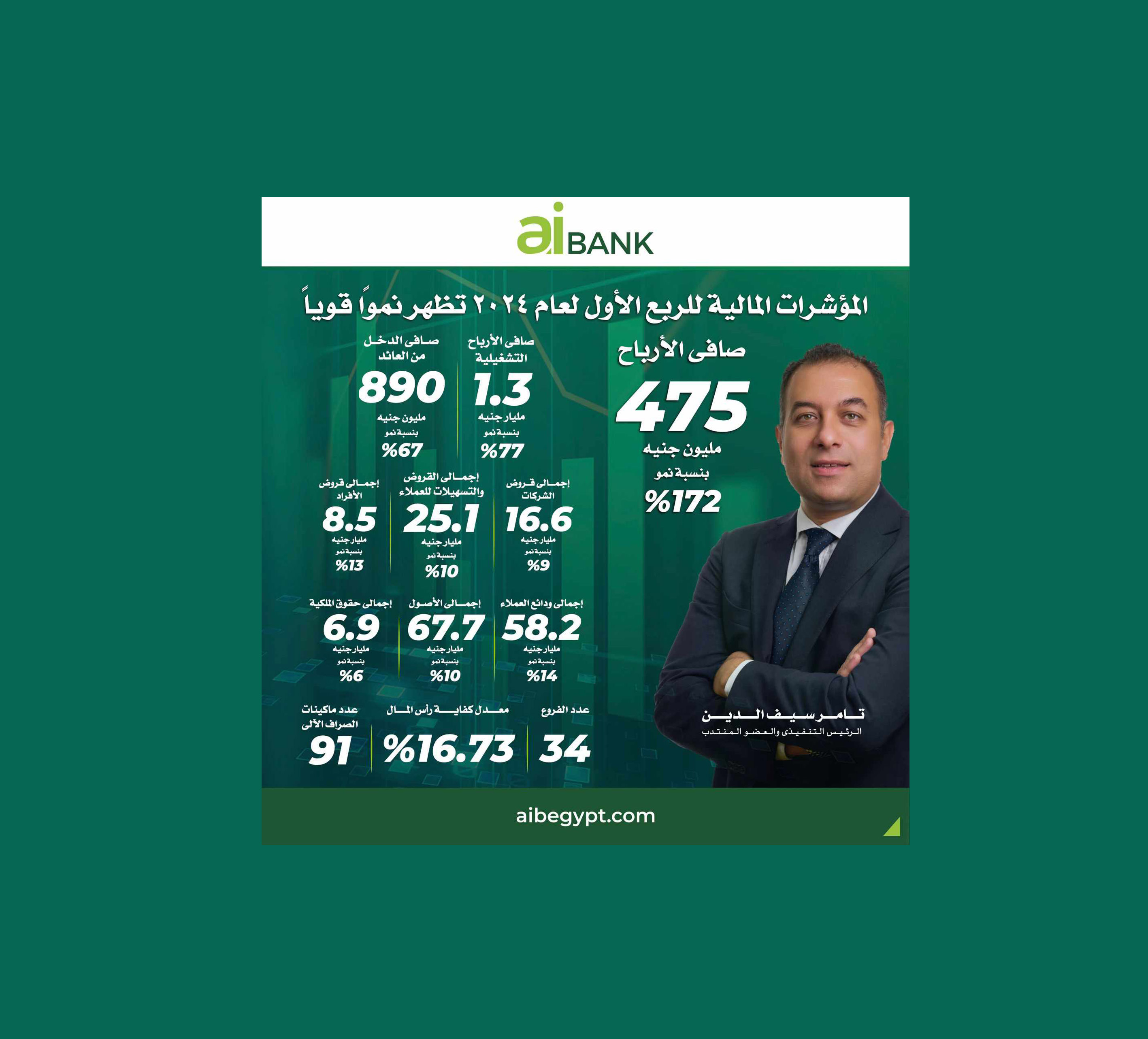 حقق “aiBANK” صافى أرباح بقيمة 475 مليون جنيه خلال الربع الأول من عام 2024، بنسبة نمو 172% مقارنة بنفس الفترة من عام 2023.