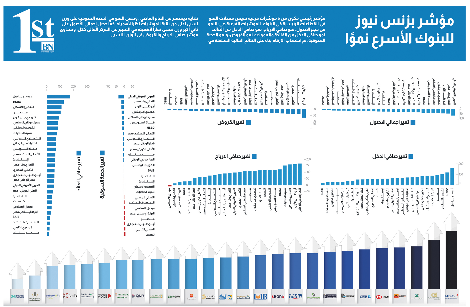 مؤشر بزنس نیوز للبنوك الأسرع نموا 2023؛ هو مؤشر رئيسى مكون من 6 مؤشرات فرعية تقيس معدلات النمو فى القطاعات الرئيسية بالبنوك.