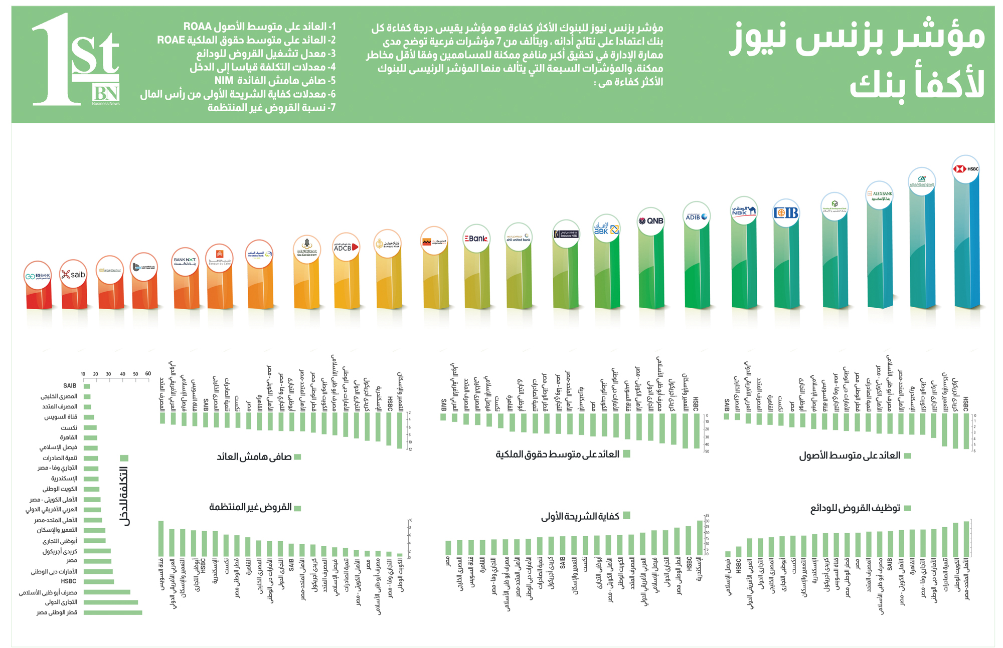 مؤشر بزنس نیوز للبنوك الأكثر كفاءة، هو مؤشر يقيس درجة كفاءة كل بنك اعتمادا على نتائج أدائه، ويتألف من 7 مؤشرات فرعية توضح مدى مهارة الإدارة فى تحقيق أكبر منافع ممكنة للمساهمين وفقا لأقل مخاطر ممكنة، والمؤشرات السبعة التى يتألف منها المؤشر الرئيسى للبنوك الأكثر كفاءة هى:
