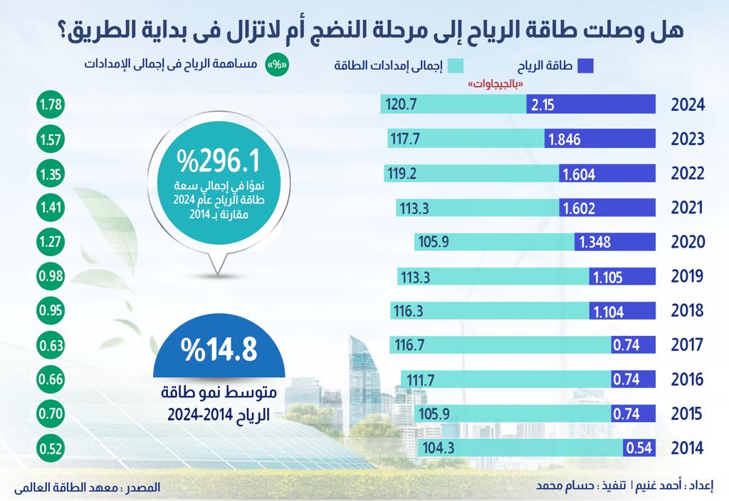 شهد قطاع طاقة الرياح في مصر نموًا كبيرًا خلال العقد الأخير، حيث ارتفعت قدرة إنتاج طاقة الرياح من 0.54 جيجاوات عام 2014 إلى 2.15 جيجاوات في عام 2024، أي بنسبة نمو مذهلة بلغت 296.1% خلال عشر سنوات فقط.