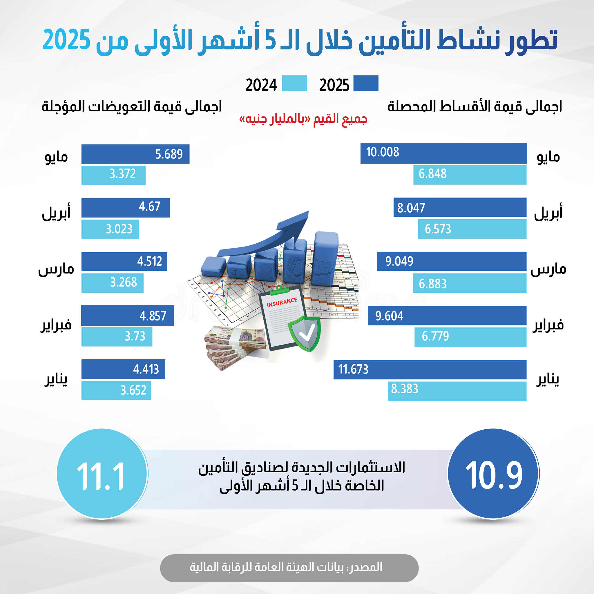 أظهرت بيانات الهيئة العامة للرقابة المالية تطورًا ملحوظًا في نشاط التأمين بمصر خلال الأشهر الخمسة الأولى من عام 2025، مقارنةً بالفترة نفسها من عام 2024، سواء من حيث إجمالي قيمة الأقساط المحصلة أو التعويضات المؤداة.