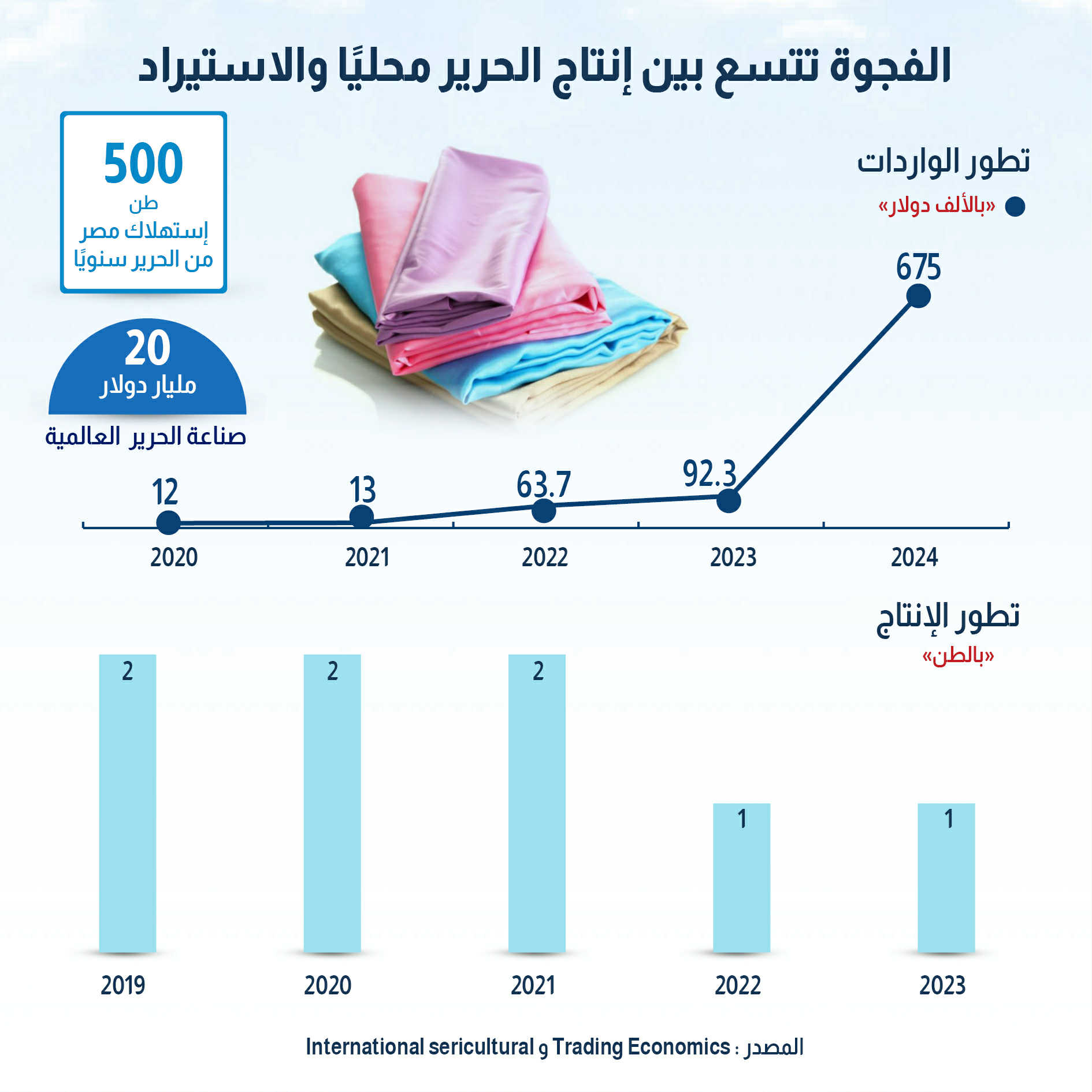 تشهد صناعة الحرير في مصر فجوة متزايدة بين حجم الإنتاج المحلي والاستهلاك، حيث يبلغ استهلاك السوق المصرية نحو 500 طن سنويًا، في حين لم يتجاوز الإنتاج المحلي 1 طن فقط في عامي 2022 و2023، بعد أن كان 2 طن خلال الفترة بين 2019 و2021.