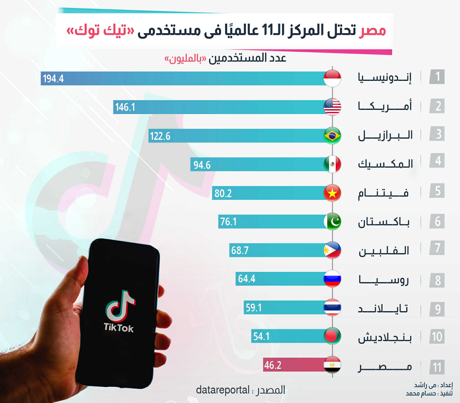 احتلت مصر المركز الحادي عشر عالميًا في قائمة الدول الأكثر استخدامًا لتطبيق “تيك توك”، بعدد مستخدمين وصل إلى 46.2 مليون مستخدم، وفقًا لبيانات Datareportal.