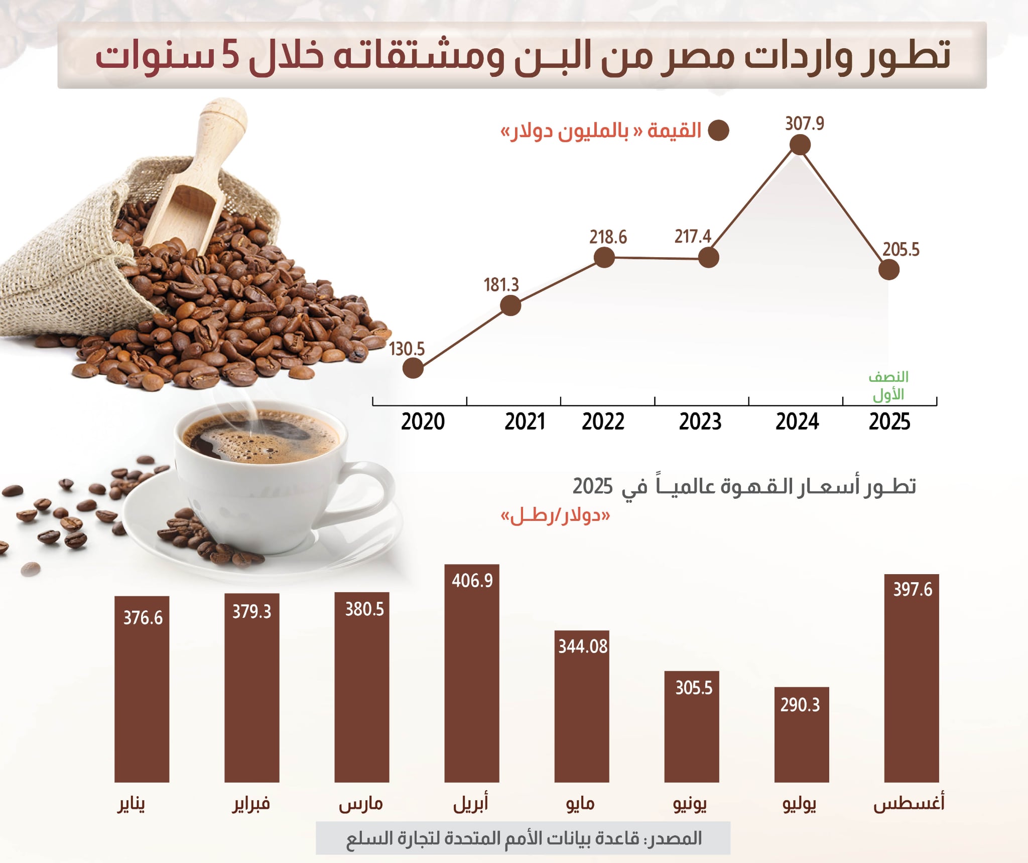 شهدت واردات مصر من البن ومشتقاته تباينًا ملحوظًا خلال السنوات الخمس الماضية، حيث بلغت قيمتها نحو 130.5 مليون دولار عام 2020، لترتفع إلى 181.3 مليون دولار في 2021، ثم إلى 218.6 مليون دولار في 2022، قبل أن تسجل 217.4 مليون دولار في 2023.