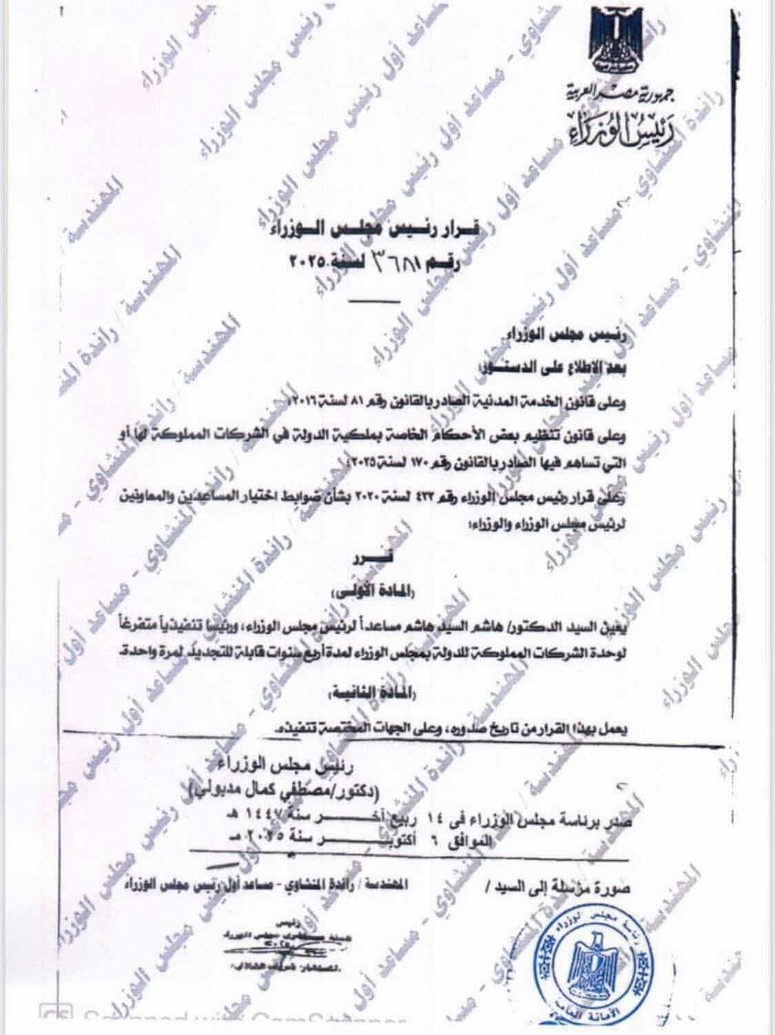 أصدر الدكتور مصطفى مدبولي، رئيس مجلس الوزراء، القرار رقم 1681 لسنة 2025، بتعيين الدكتور هاشم السيد هاشم مساعدًا لرئيس مجلس الوزراء، ومسئولًا تنفيذيًا متفرغًا لوحدة الشركات المملوكة للدولة، وذلك في إطار خطة الحكومة لتعزيز كفاءة إدارة الأصول المملوكة للدولة ومتابعة تنفيذ سياسات إعادة الهيكلة والتطوير.