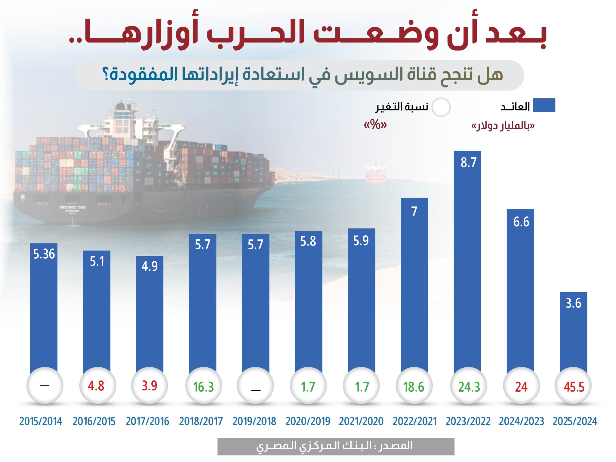 أظهرت بيانات البنك المركزي المصري أن إيرادات قناة السويس شهدت تراجعًا حادًا خلال العام المالي 2024/2025 لتسجل نحو 3.6 مليار دولار بانخفاض بلغت نسبته 45.5% مقارنة بالعام السابق الذي حققت خلاله القناة 6.6 مليار دولار.