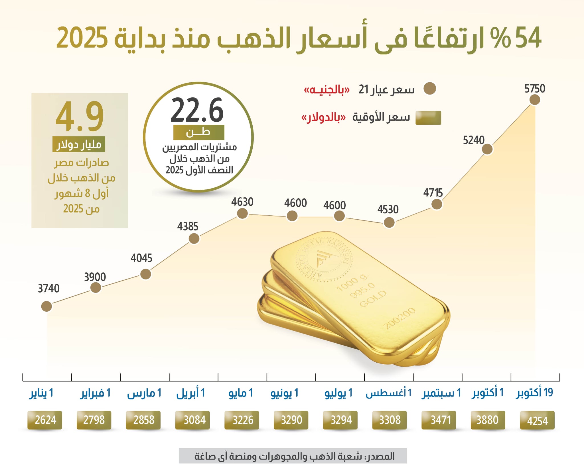 شهدت أسعار الذهب ارتفاعًا كبيرًا منذ مطلع عام 2025 بنسبة بلغت 54%، حيث صعد سعر جرام الذهب عيار 21 من 3740 جنيهًا في يناير إلى 5750 جنيهًا في 19 أكتوبر، بينما ارتفع سعر الأوقية عالميًا من 2624 دولارًا إلى 4254 دولارًا خلال الفترة نفسها.